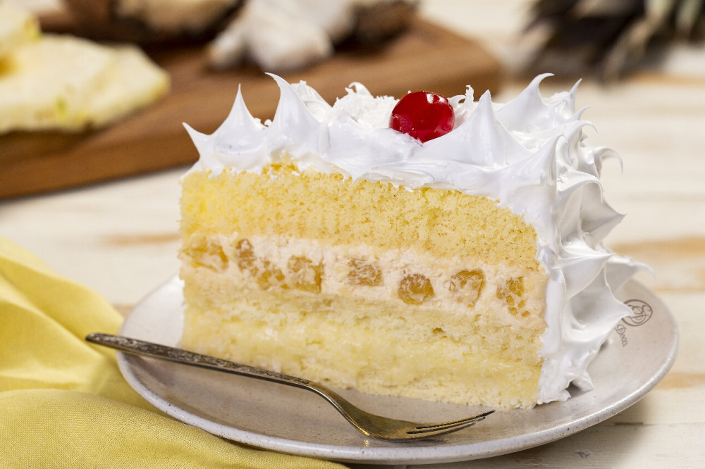 O sabor Abacaxi com Coco#37 é ideal para quem aprecia a combinação de sabores tropicais. Esse bolo tem massa branca, recheio de mousse branca com abacaxi e cocada. A cobertura é de marshmallow, coco cozido e finalizado com cerejas decorativas.